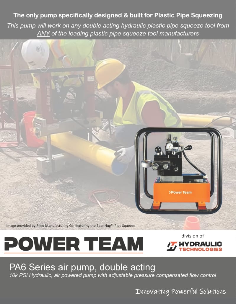 Our plastic pipe squeezing pump includes a pump-mounted, pressure-compensated, adjustable flow control valve seamlessly integrated with a manually operated, 5-position, detented, 4-way valve purpose-built for hydraulic double-acting squeeze tools. Additionally, this valve features a bolted-on, pilot-operated check valve to enhance its versatility.